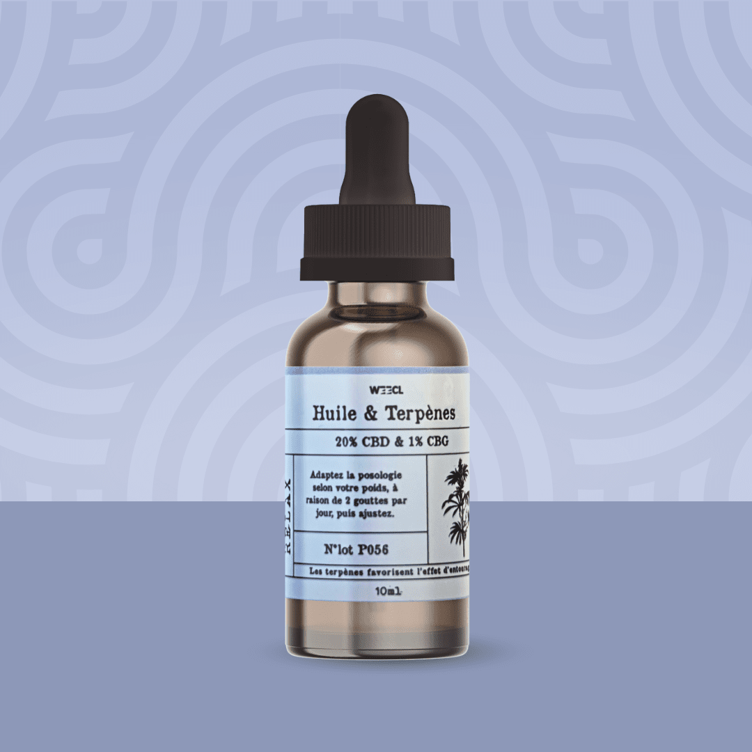 Huile Relax CBD 10ml 🌿 : CBD à spectre large + 1 % CBG, enrichie en terpènes naturels pour un effet détente sans THC. 🌸 Goût léger, base tournesol 🌻.